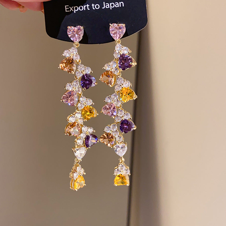 Silver Needle Retro Light Luxury Style Zircon Heart Tassel Earrings